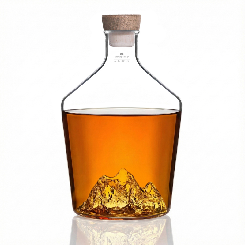 At the bottom of the decanter rises the Everest, molded in three dimensions and mouth-blown. As the glass fills, the amber reflections of the spirits highlight the details of this legendary peak. Every pour becomes a visual spectacle.